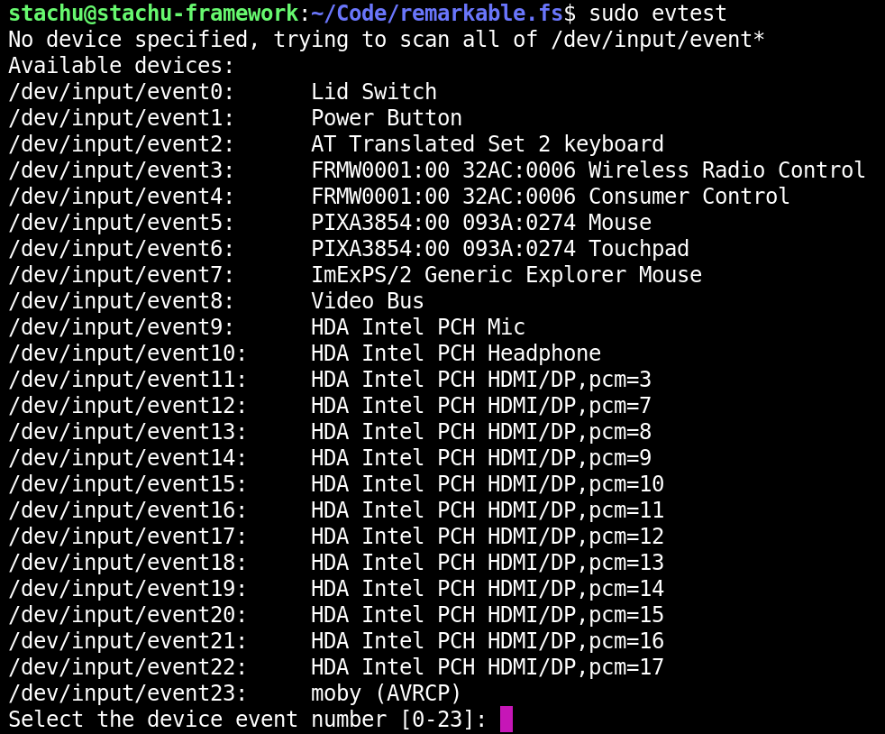 I'd recommend researching evtest further, but the summary here is that we can use the tool to understand the raw events that we can listen for - and what types of values and ranges those events might be in. (for example, there's a ton of cool data around the digitizer movement, including tilt and pressure).