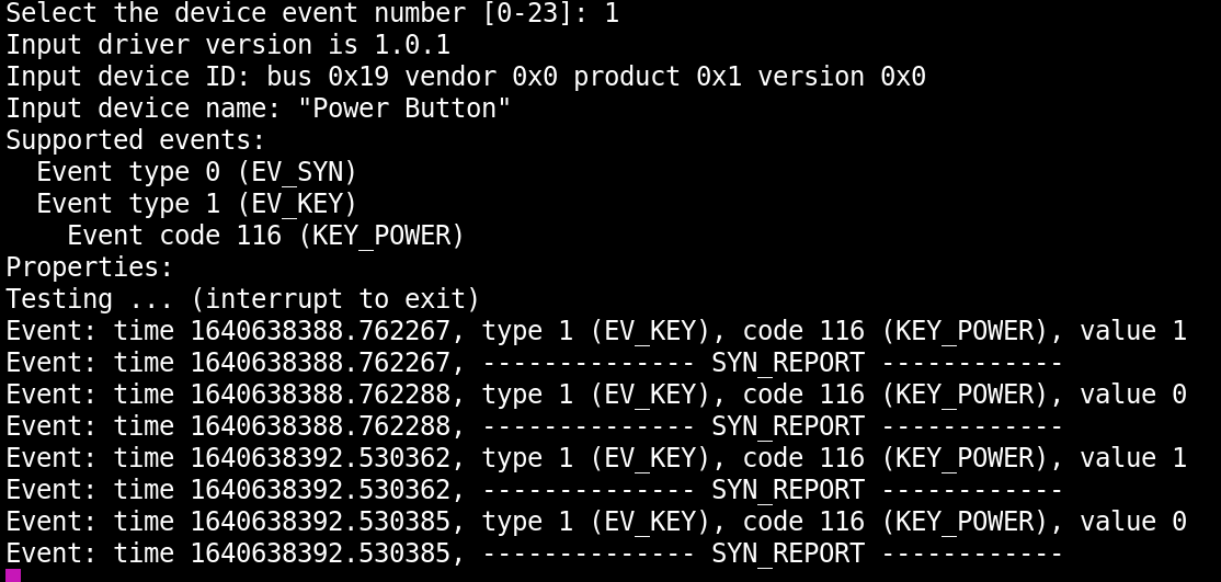 From this point, you can choose the event device number (let's say I wanted to listen to whenever hit the power button on this laptop - I would chose '1', and then start playing with that input: